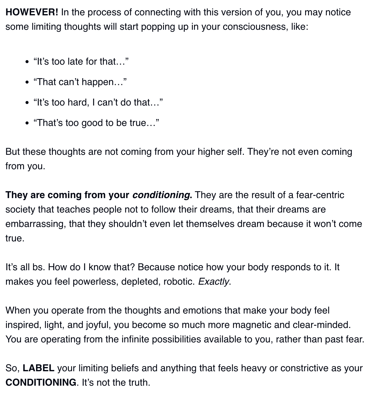 As I wrote in a previous letter on how to rewire your brain, thoughts come from either your conditioning (meaning: past fears, traumas, negativity from parents or peers), or your calling (Source, God, your intuition, your joy, what makes you light up inside).